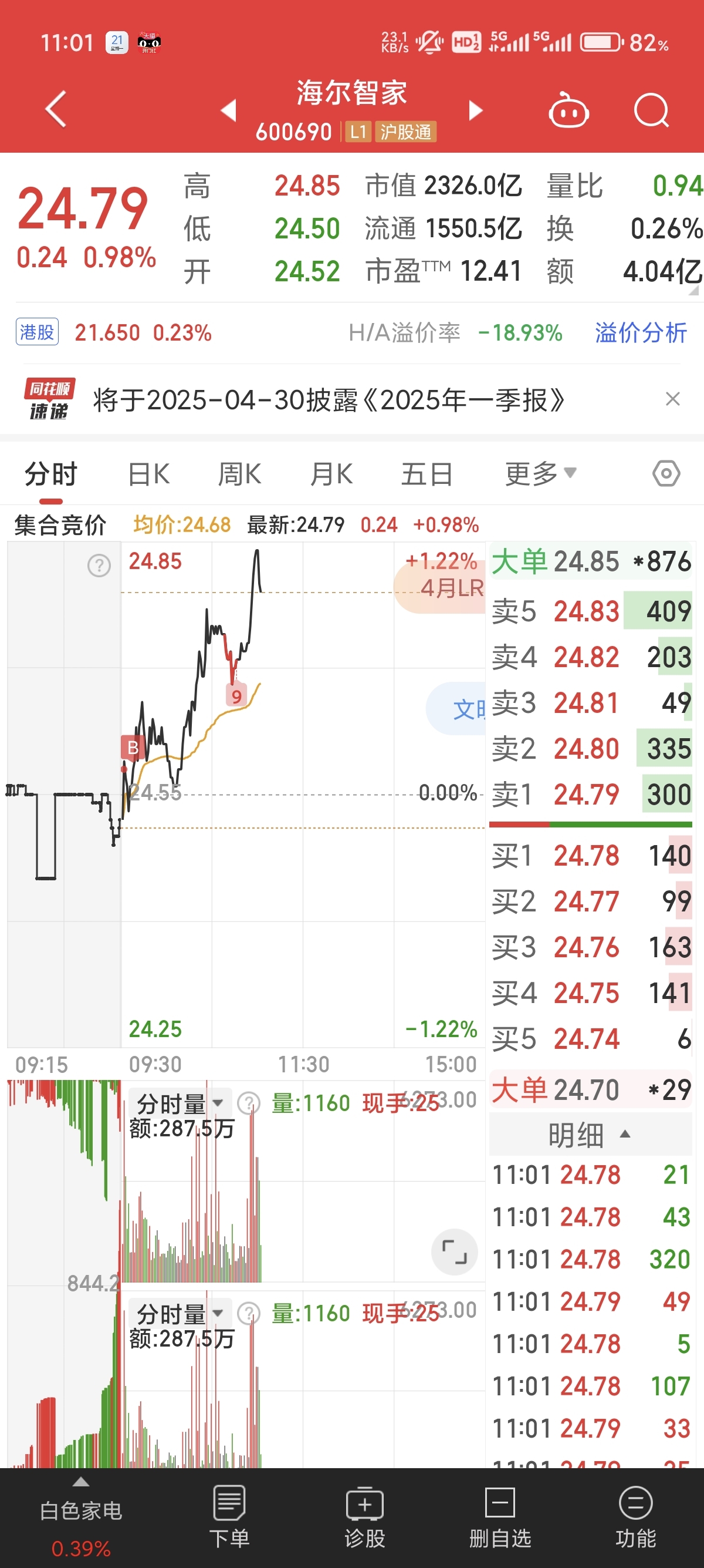 $海尔智家(SH600690)$ 说到做到,今天卖杂毛,加海尔