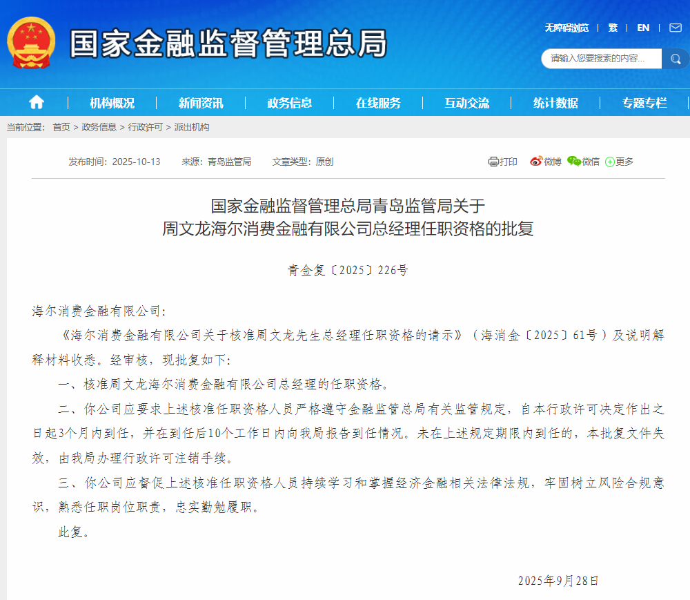 10月13日,国家金融监督管理总局青岛监管局发布两则任职资格批复,核准周文龙海尔消费金融有限公司(简称“海尔消金”)总经理、俞文佳海尔消费金融副总经理的任职资格。