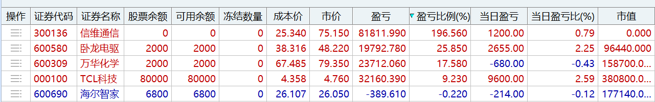 今天清了涨得太高的信维通信,买入海尔。理由是:这波牛市,作为白电龙头、销量第一的海尔不涨反跌。原因无非一不是热点,二压价回购。或许一年两年也赶不上赛道,但在基本面没有问题的情况下,补涨应该是可以的。不指望大赚,只求稳定占市值好打新。