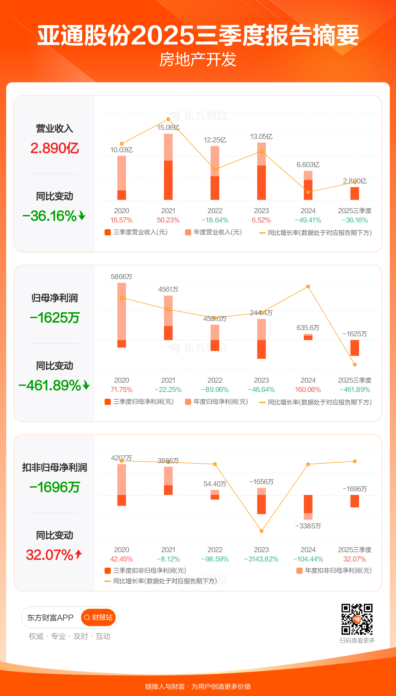 亚通股份10月30日发布2025年三季报显示,公司前三季实现营业收入2.89亿元,同比下滑36.16%;归母净利润-1625.21万元;扣非归母净利润-1695.84万元。