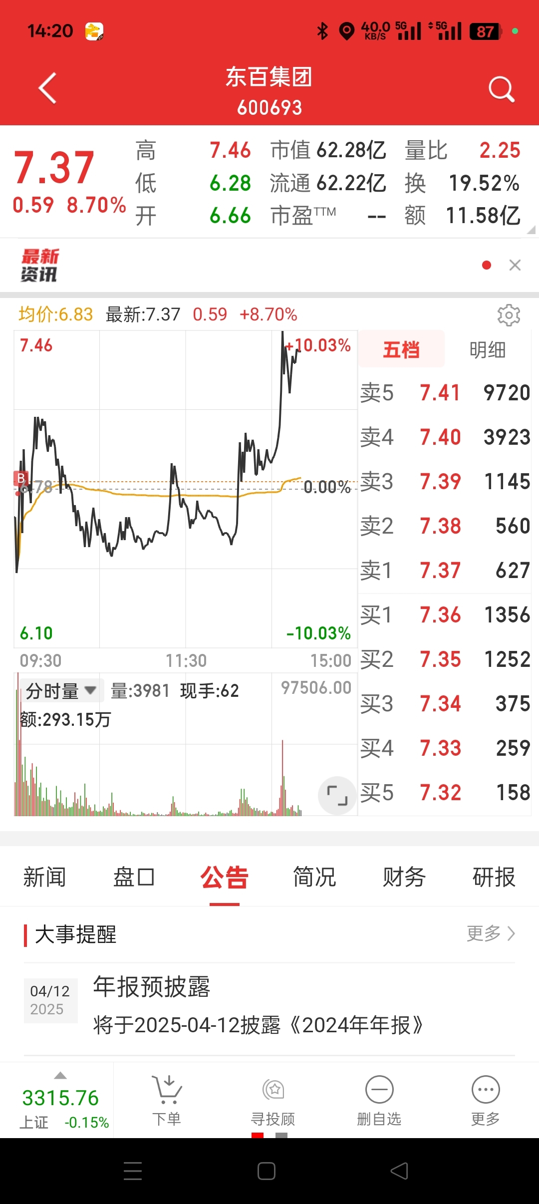 $东百集团(SH600693)$ 今天上午又补了仓的,加油加油,冲吧,来个三版定龙头