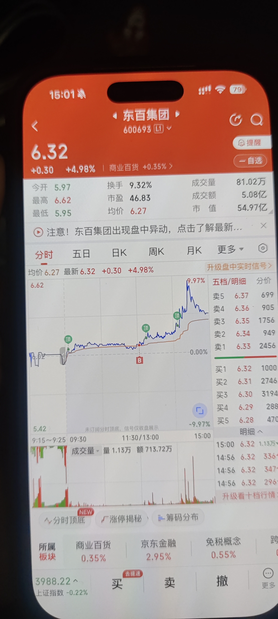 $东百集团(SH600693)$ 出货了 明天不妙
