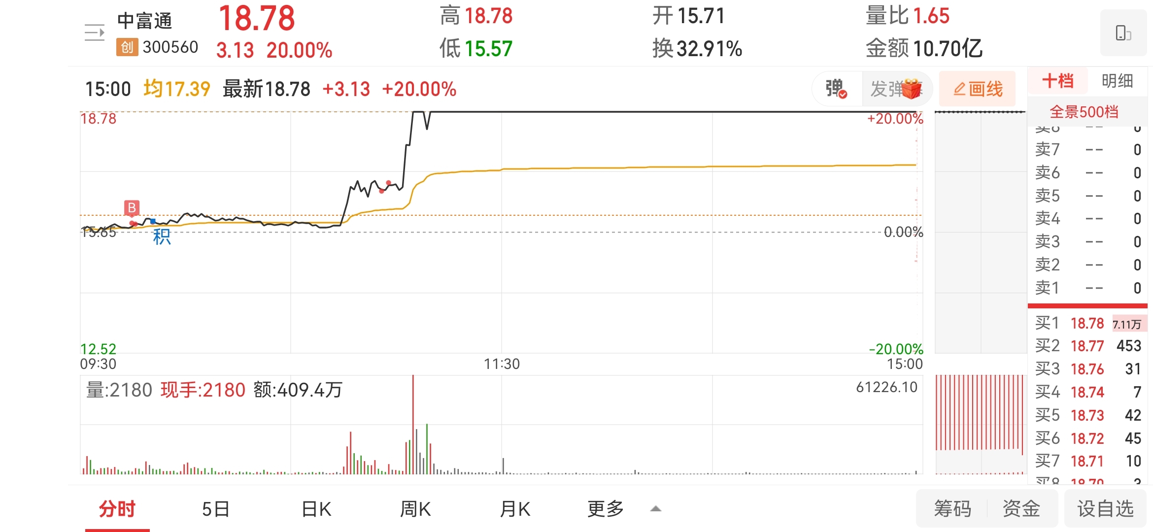 T出去的,犹豫了十分钟,买了中富通,运气挺好,同时自己也是有能力的,有准备的,形态和东百起飞前大同小异,明显有资金运作(合富中国,中富通,真不是看名字买的。但这里是大A),