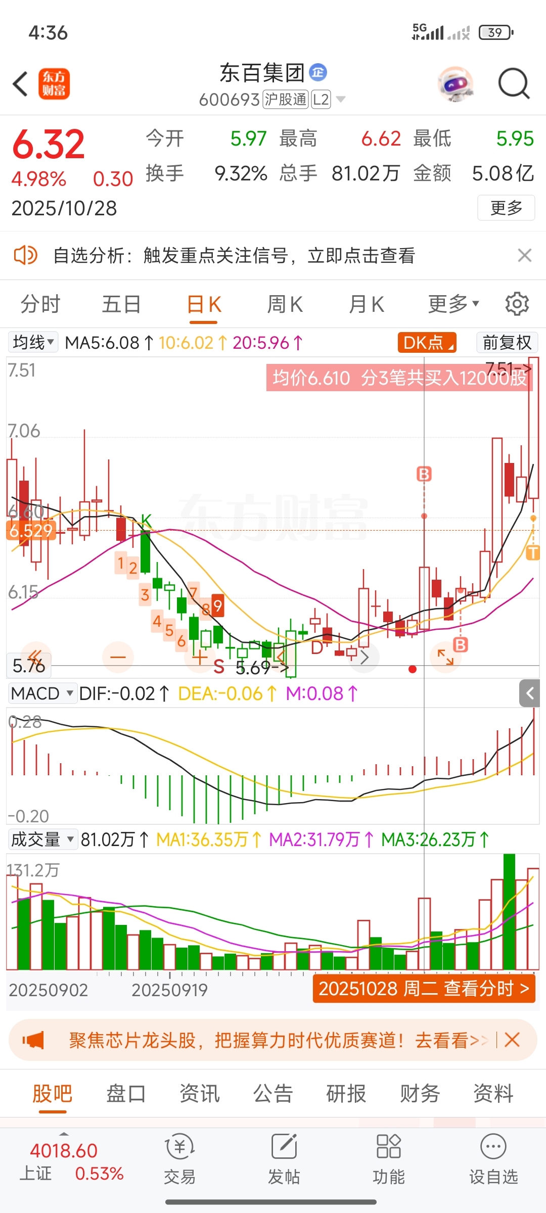$东百集团(SH600693)$ 从10月28号买到最高点6.61,中途30号最高亏损9个点多,一直没放弃,一路真是不容易,好几次差点洗下车,心态真的很重要。