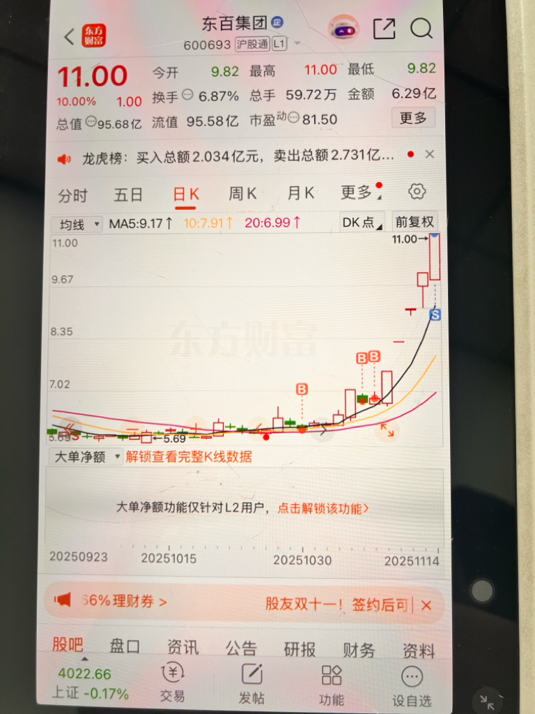 $东百集团(SH600693)$ 卖飞了……以为还跟昨天一样的了