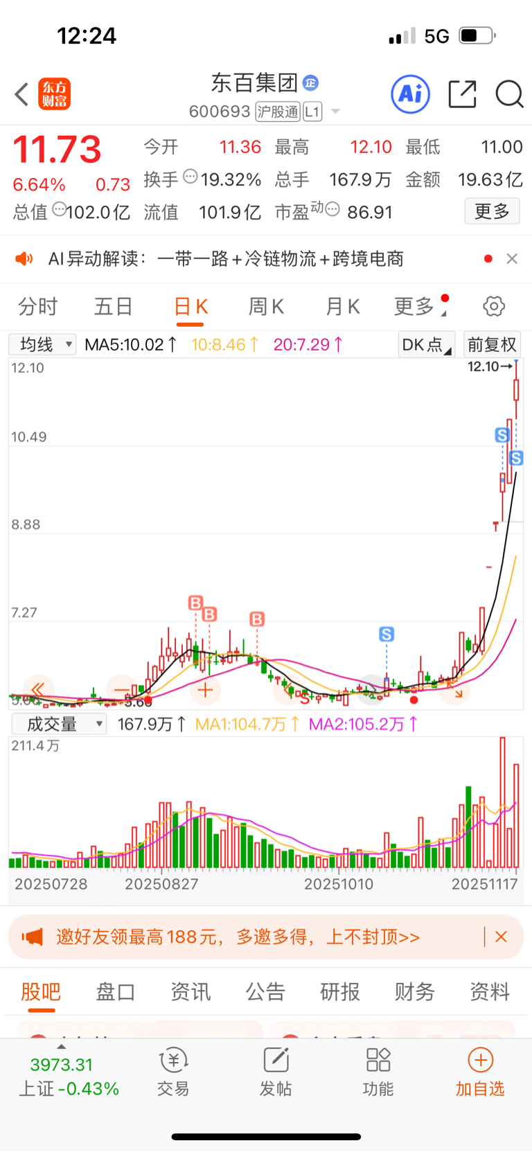 $东百集团(SH600693)$ 今天涨停清仓,留下的各位发财。
