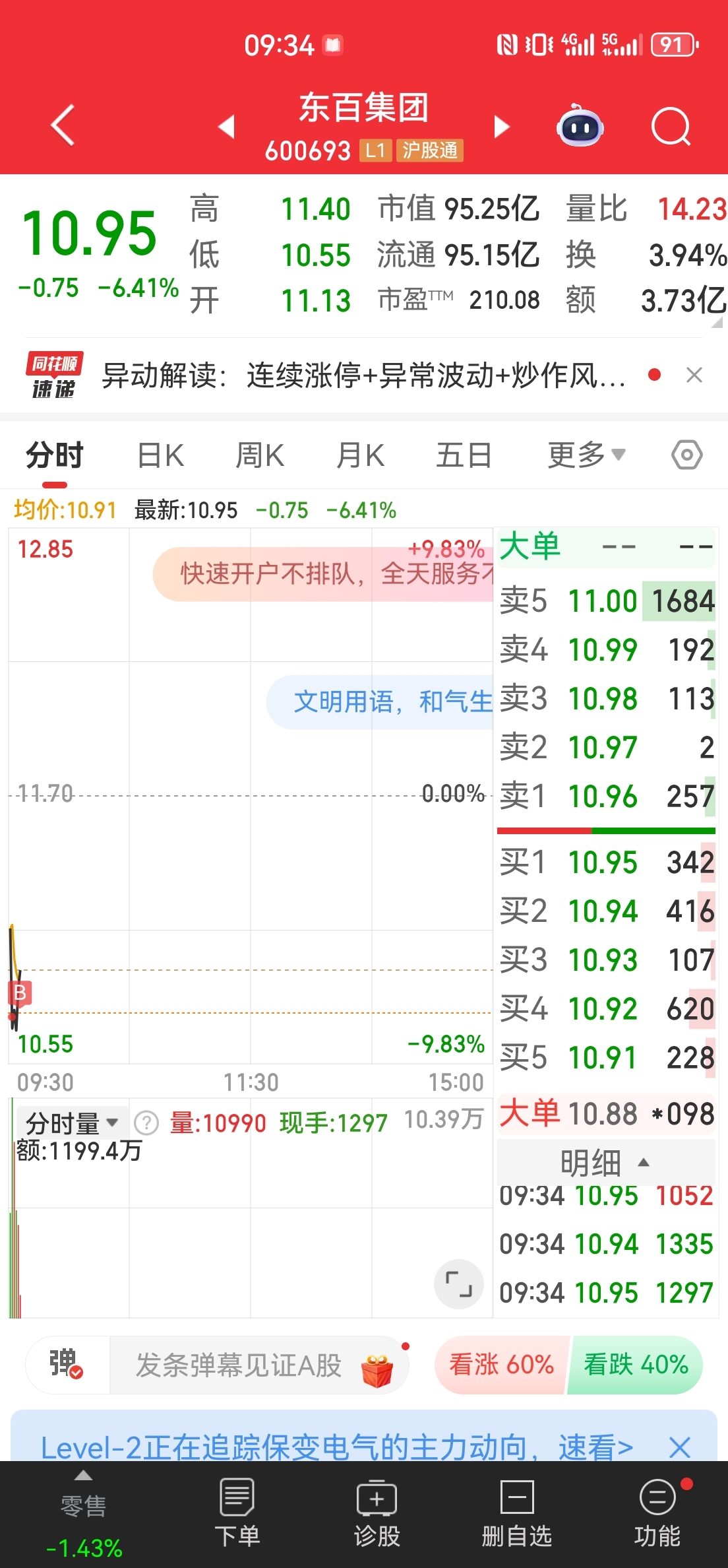 $东百集团(SH600693)$ 一万到一百万第21天,保变开盘走了,-8买了东百集团