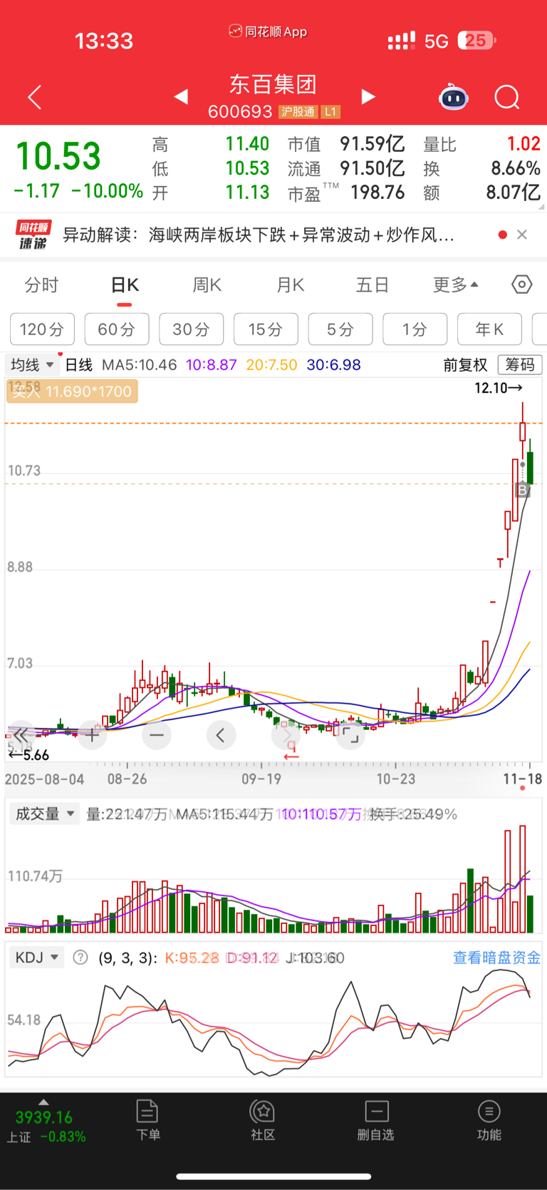 $东百集团(SH600693)$ 我昨天买2万成功干挺它了