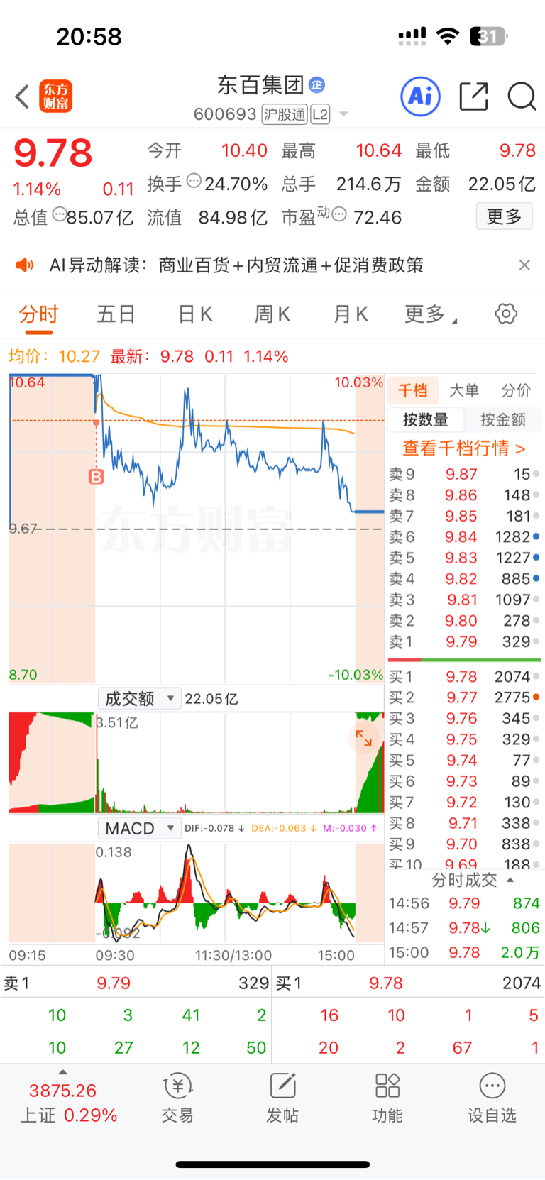 $东百集团(SH600693)$ 本来今天早上看了一眼,板了,美滋滋,下午一看,天塌了