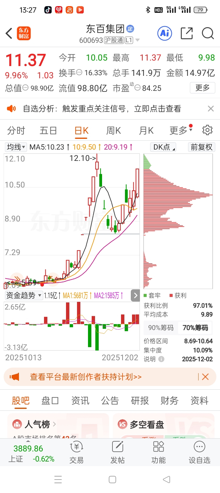 $东百集团(SH600693)$ 绩优股。满不满意。冲涨停板了。大家买了吗!
