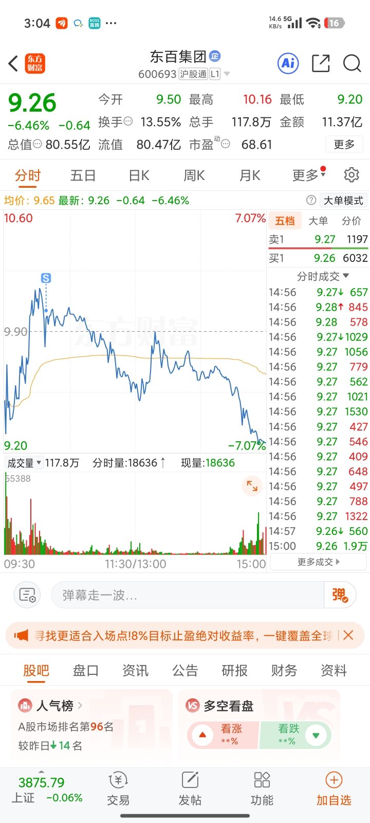 $东百集团(SH600693)$ 杂毛就是杂毛,亏你三个点走了。