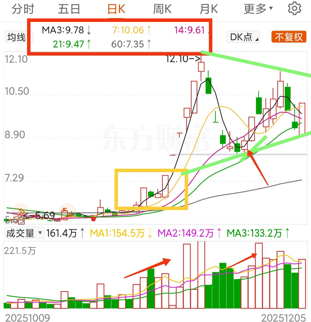 如图所示,前面多头炮开局,突破拉升创出阶段高点12.1,开始深度回调修复。回调幅度深,主要还是有拉升中有一字。虽然走出反包,但个人看,大趋势还是修复整理,都说量在价先,从成交量看,还没高于前高时的量,后期了持续关注这点。