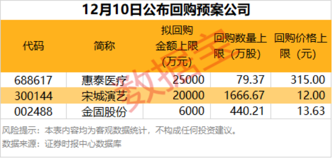 12月10日,惠泰医疗、宋城演艺、金固股份等3家公司披露股份回购方案。