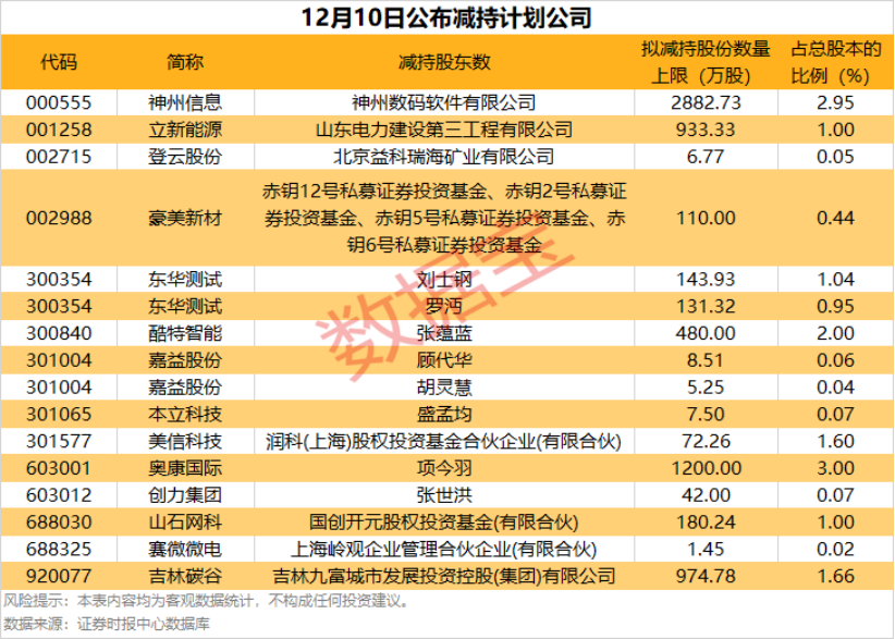 12月10日,14家公司发布了减持计划,拟减持比例居前的有奥康国际、神州信息、酷特智能等。