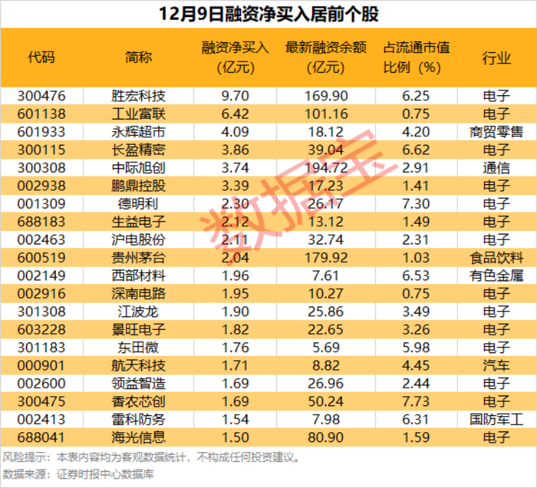 具体到个股,12月9日获融资净买入千万元以上的有537只,其中42只融资净买入额超1亿元。胜宏科技融资净买入额居首,当日净买入9.70亿元;其次是工业富联、永辉超市,融资净买入金额分别为6.42亿元、4.09亿元;融资净买入金额居前的还有长盈精密、中际旭创、鹏鼎控股等。