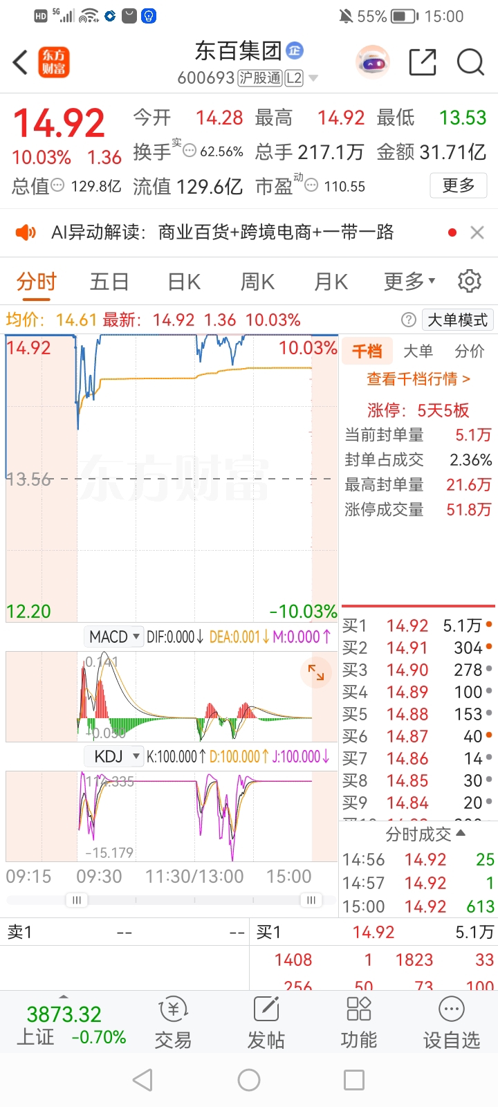 看看龙头东百集团五连板,买股还是要买板块龙头,广百这种后排股两天亏我十几个点!
