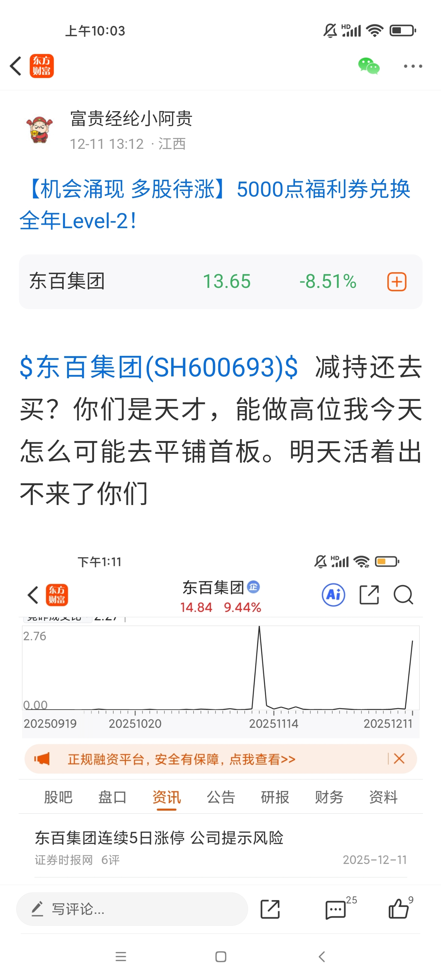 $东百集团(SH600693)$ 昨天买东百的就该亏,人家发布了公告减持了,其次昨天的茂业和永辉根本不强。看不懂盘面敢去高标的他们确实是天才,我昨天叫他们涨停别接而是卖还阴阳我。
