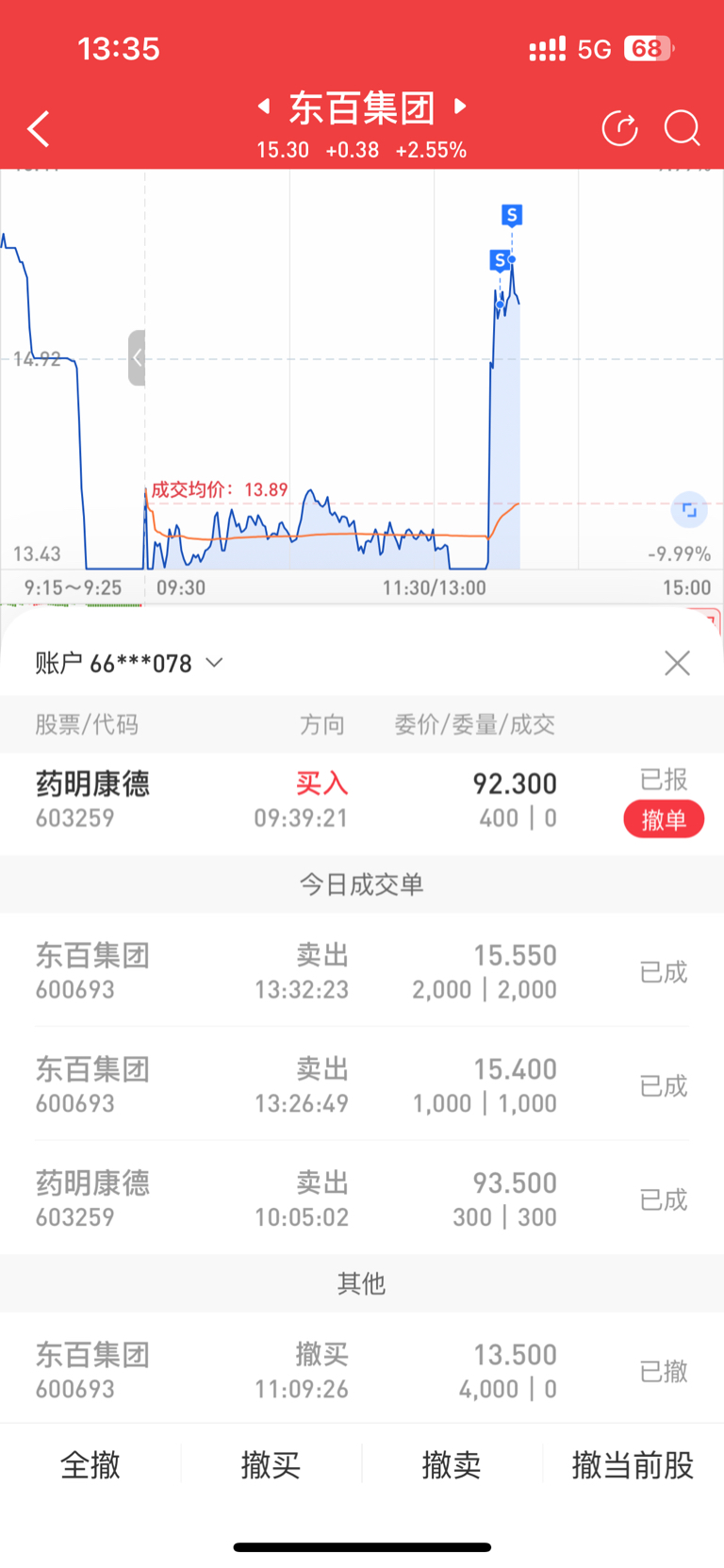 $东百集团(SH600693)$ 看不懂啊,午觉醒来突然跌停,还在庆幸早上挂的13.5买单撤掉了,一转头发现拉升了,第一次15.40卖了1000,以为自己卖的2000,又赶紧卖了2000,剩下1000股,这下成本降成2.9了,跌停也不怕了