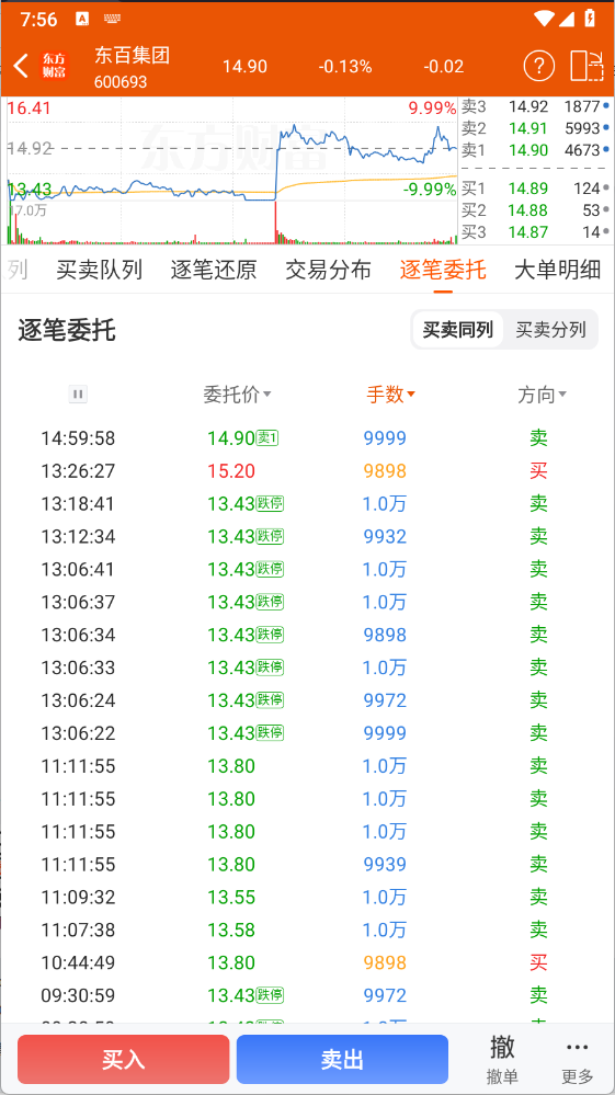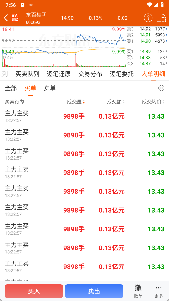 我东方财富的app,为什么在逐笔明细里没有13:22分小群的9898,在大单明细