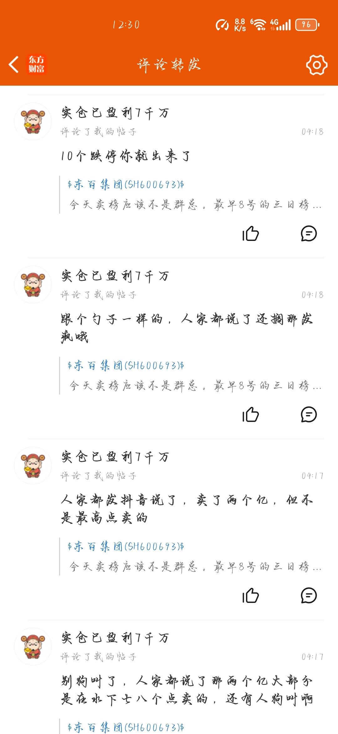 $东百集团(SH600693)$ 你这是亏了多少,叫的人家APP自动都给你屏蔽了。还是被我说对了,影响你在这里带节奏呢,10个跌停我也不怕啊,我就一点底仓,还是昨天负8进的。人家小群的意思看不出来吗,他那天买了2个亿,肯定卖不了,那那些货哪来的?翻到8号的三日榜,都没有这个席位,就算每天不上榜进货,这几天他也凑不出1.8亿的货来。你总不能说他没进永辉之前就埋伏了吧。