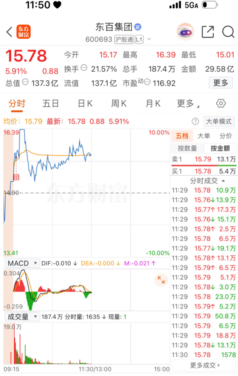 $东百集团(SH600693)$ 开盘很快就封了,冲击力大,一直冲高回落,希望午盘回封