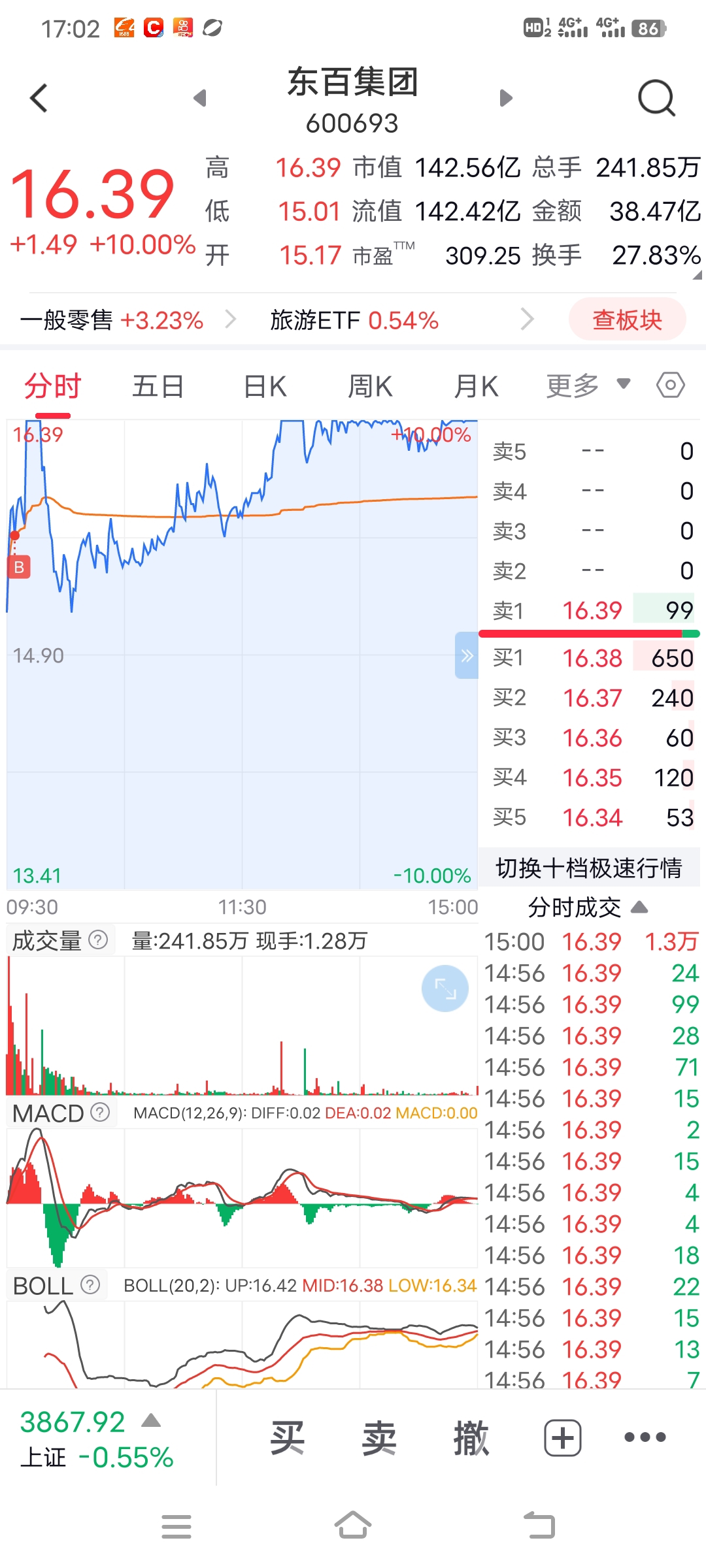 $东百集团(SH600693)$ 开盘的时候就多设了1毛钱,这都没成交!我很少很少在盘中追高的(因为每次盘中追高第二天基本吃面),今天追了一点!这个盘中分时走势我在心里已经计提-10了,今天收盘是炸板的,没有封单!除非今晚消费有超级大利好!还是得坚守自己的交易原则,错过就不要再进了!发个帖提醒一下自己坚守自己制定的交易纪律。