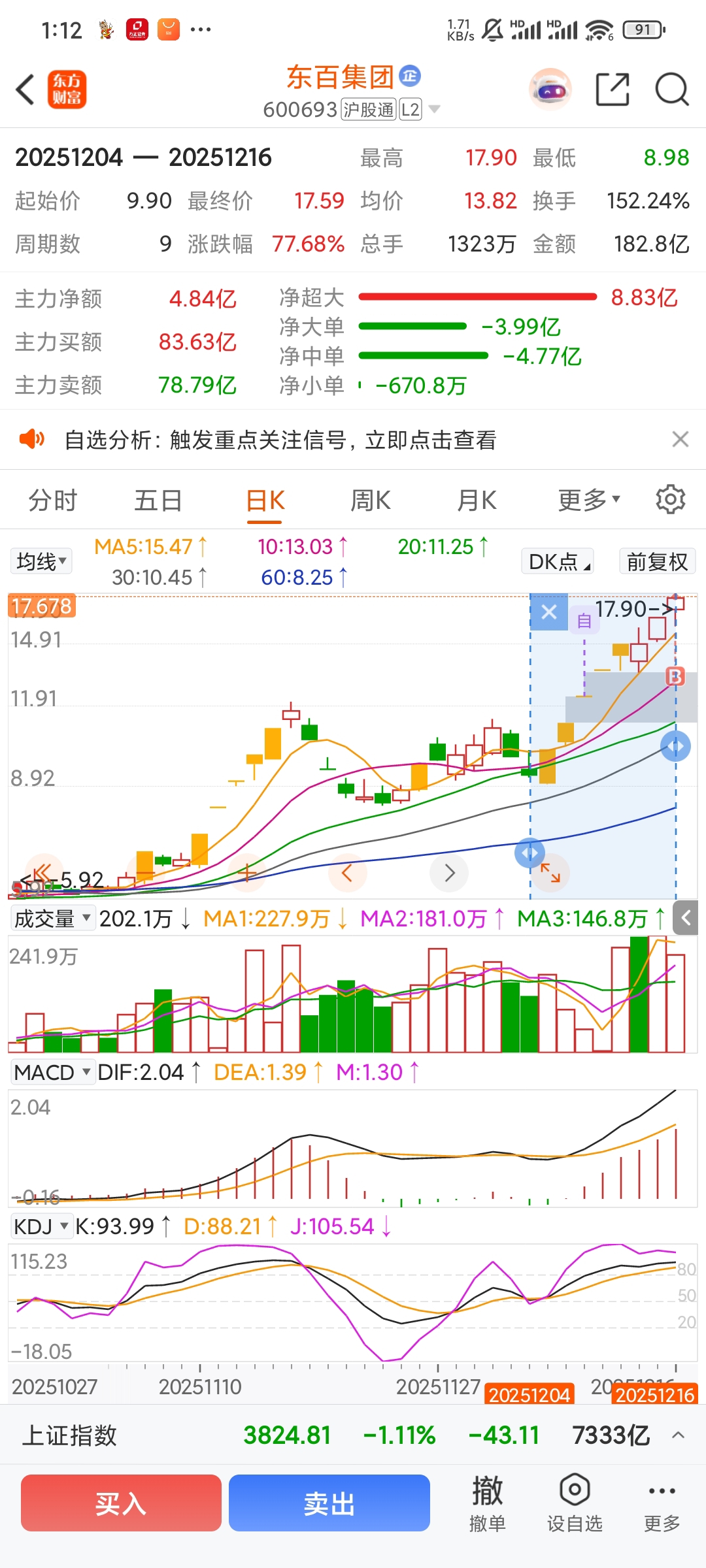 $东百集团(SH600693)$ 一个个都说控异动,30天涨幅149%,10天涨幅77.68%,加上大盘1.78%,也才80%左右 ,还有20%的上涨空间,怎么就到异动了呢?不明白
