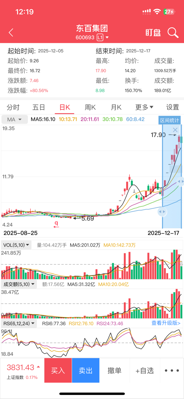 $东百集团(SH600693)$ 今天星期3缩量下跌可以继续买入、明天反包、总之还没走完、今天砸到深水、明天涨停就没有异动了。而且板块依然强势、百大集团五板换手涨停、利群股份一字换手晋级二连板、皮阿诺也有望晋级三连板、所以再不济也会修复。$百大集团(SH600865)$ $利群股份(SH601366)$