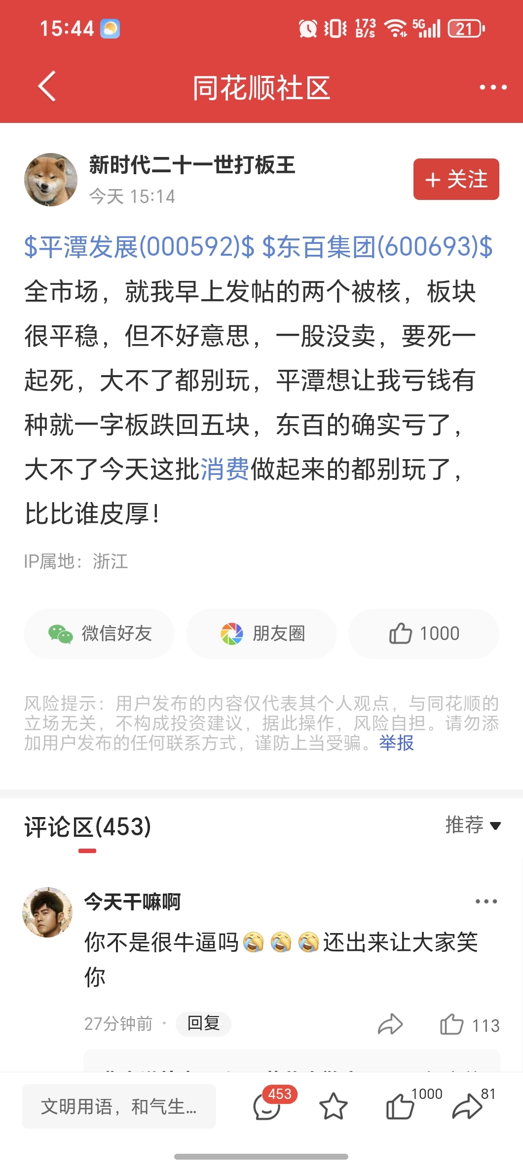 $东百集团(SH600693)$ $平潭发展(SZ000592)$ 要怪就怪这个人,没事炫耀什么,还左手东百右手平潭,就是这个很多粉丝的人炫耀连累大家了!