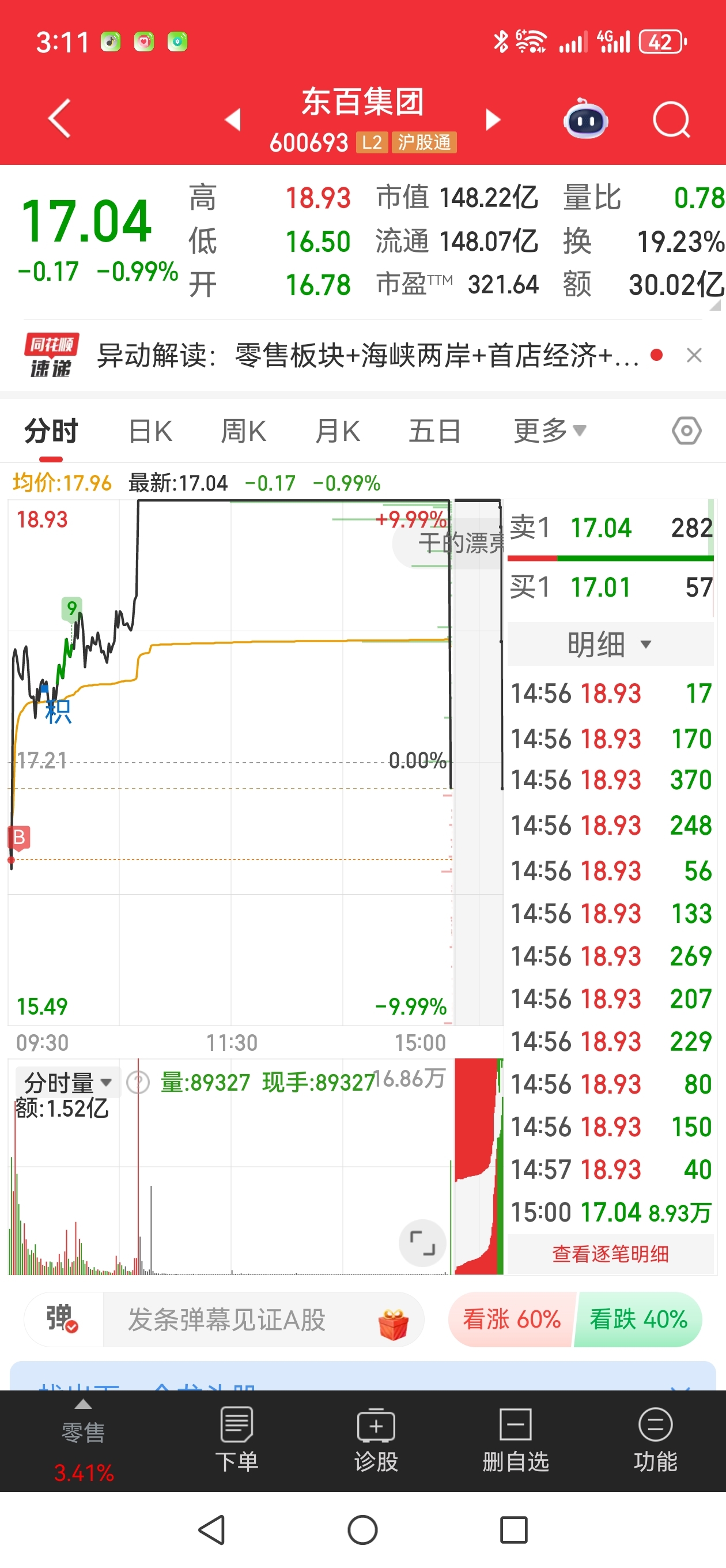 $东百集团(SH600693)$ 股票一天亏8个点我都不带眨眼的,因为有赚有亏很正常,哪怕盘中天地板我都觉得正常,但是尾盘竞价几十秒涨停砸下来11个点,确实让我昨天吃饭都多喝了点啤酒,这股我之前也有将近20个点利润,周五早晨低开我又杀回来了,本来又要给我14个点利润,结果竞价这么搞?别看周五仍然赚钱,比亏钱还难受
