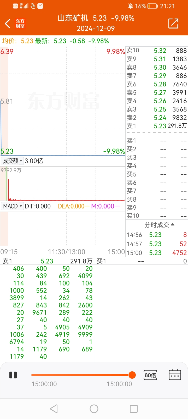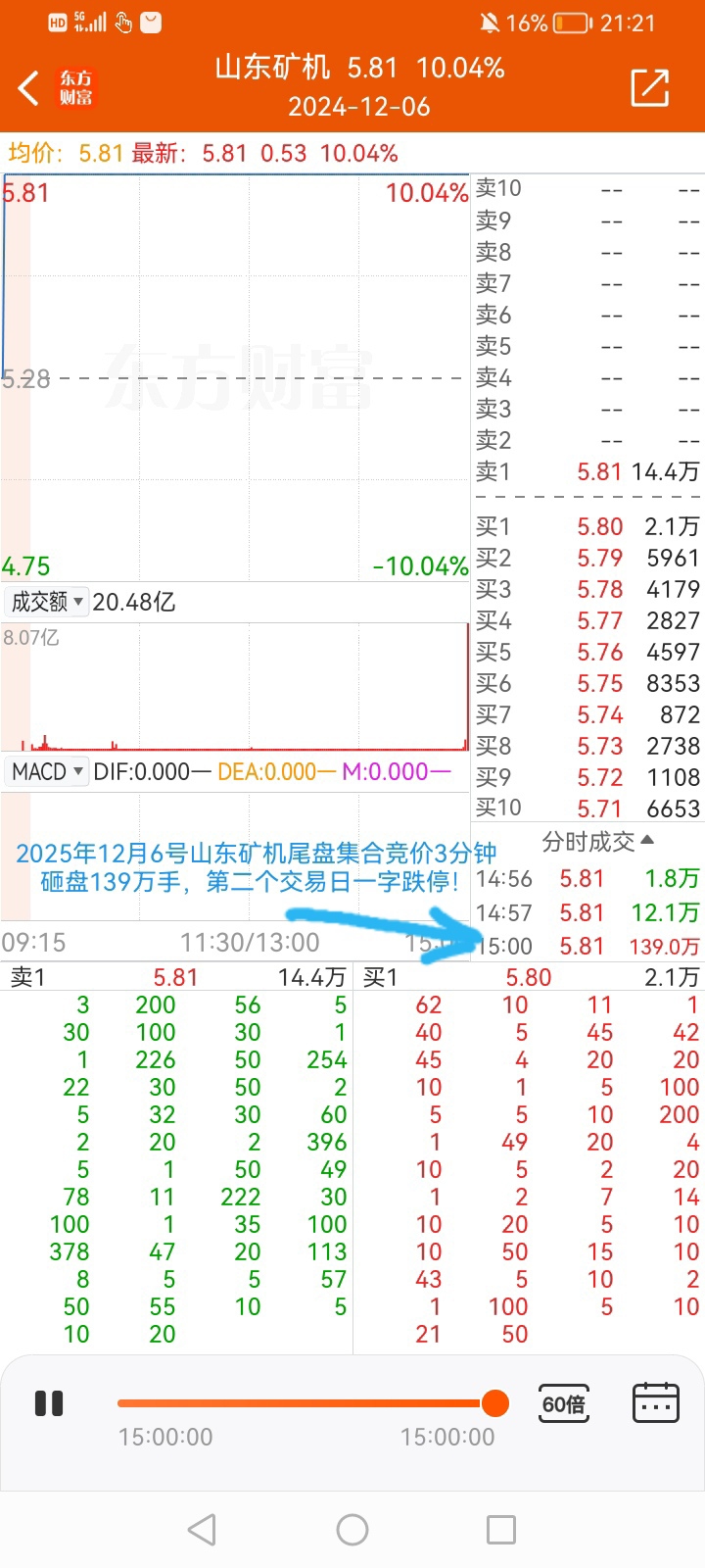 $东百集团(SH600693)$ $平潭发展(SZ000592)$ $山东矿机(SZ002526)$ 大家可以去东方财富超级复盘看一下山东矿机2024年12月6号的走势!山东矿机在2024年12月6号(星期五)尾盘集合竞价砸盘出货,次日一字跌停!