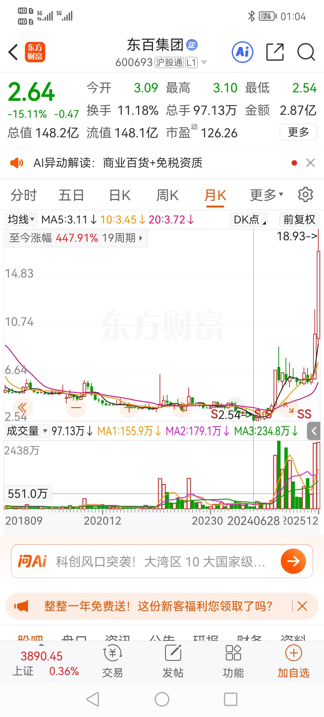 $东百集团(SH600693)$ 我的成本价,才2块多,有本事来10个跌停,没见过,最后一秒钟出货的。