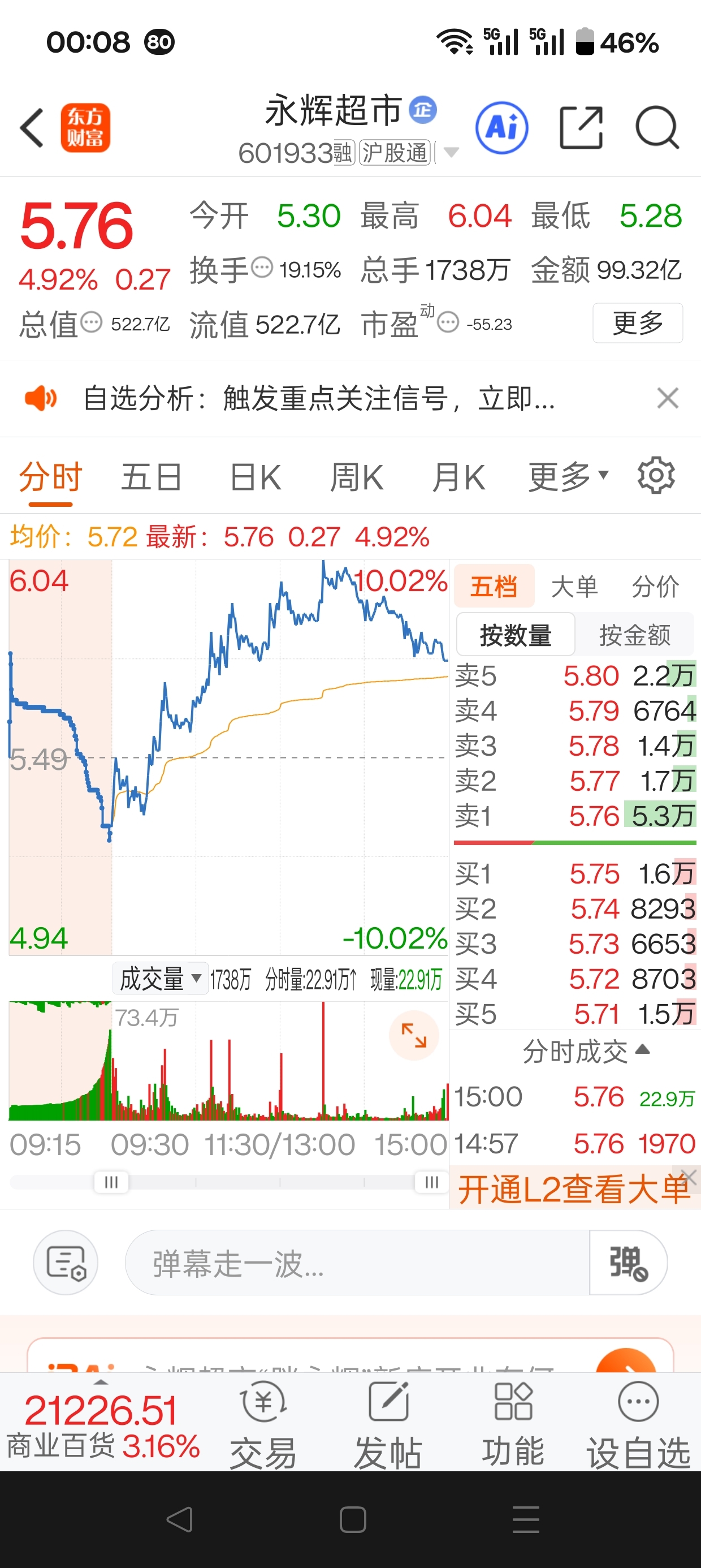 $东百集团(SH600693)$ 尾市永辉超市也没有跳水。