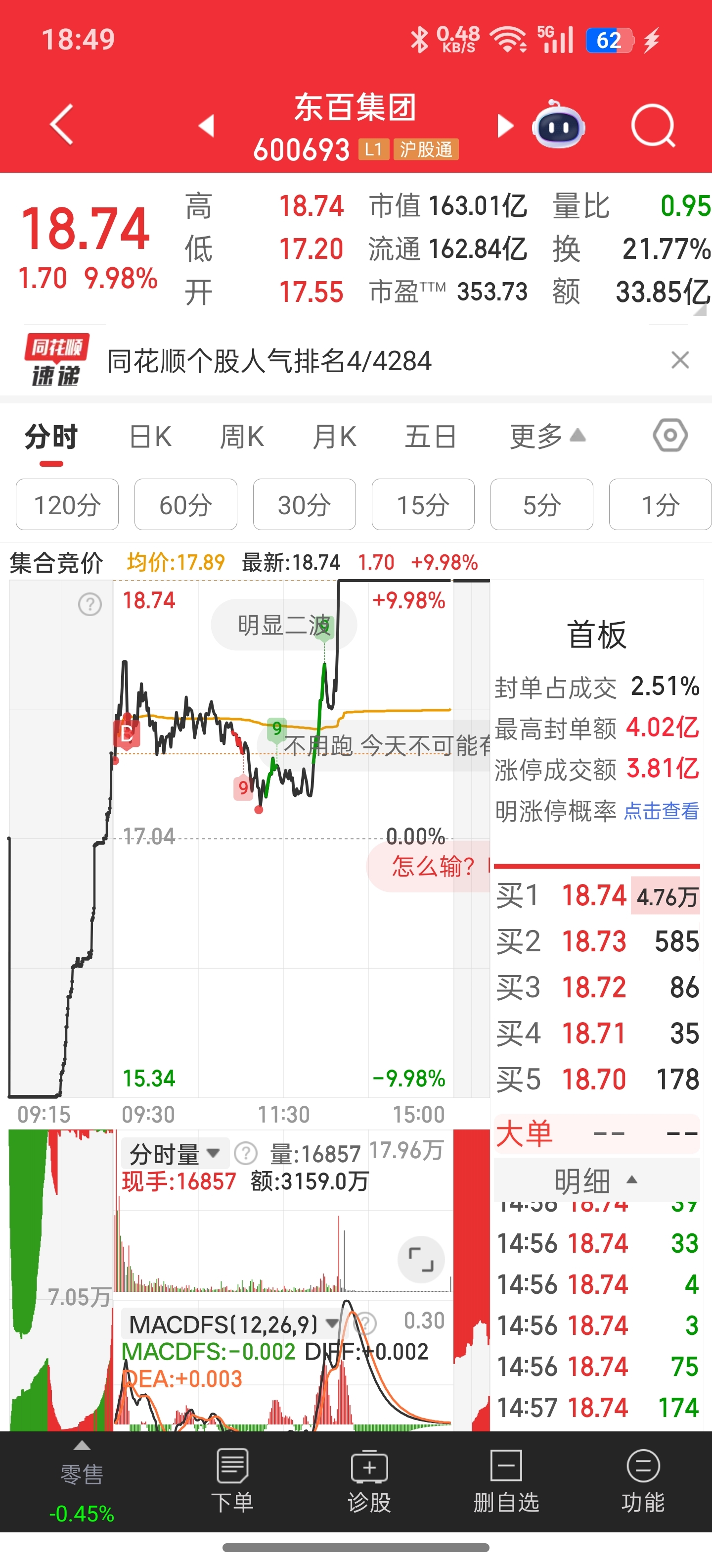 $东百集团(SH600693)$ 尽人事,听天命。集合竞价一笔,回落均线一笔,五日线又吸了一笔。感觉这个操作还行