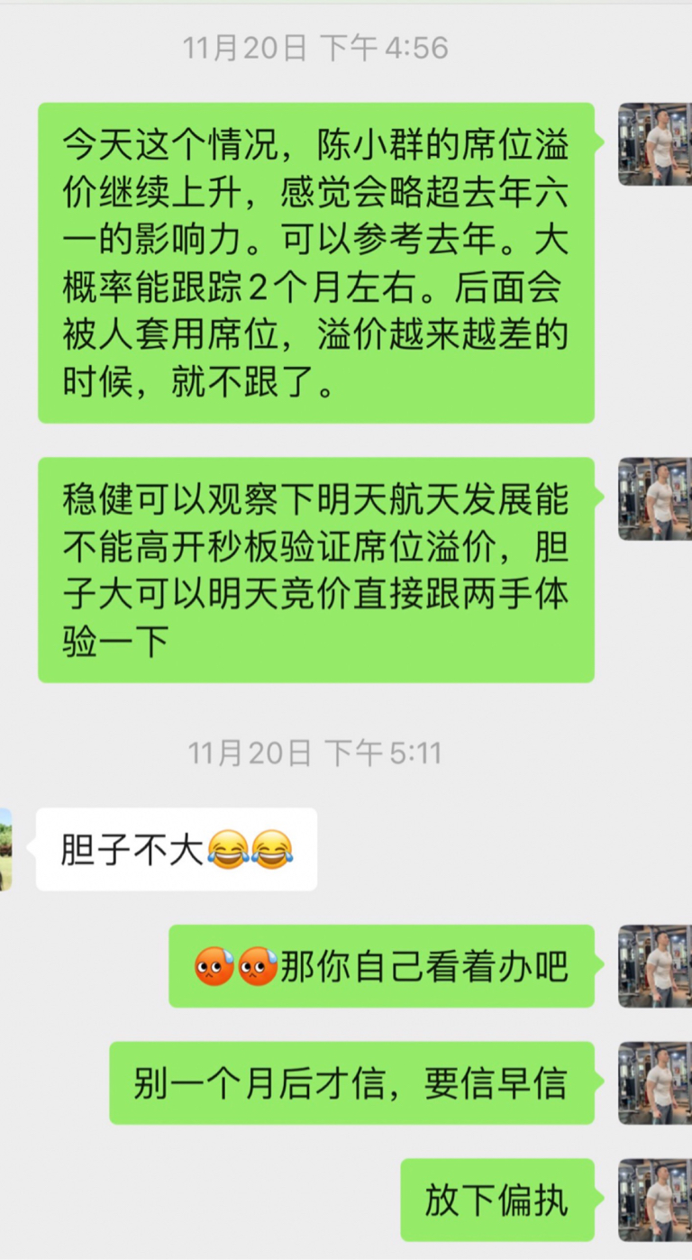 图2是我和朋友在11月22号预判接下来跟随群总必有溢价的言论。验证