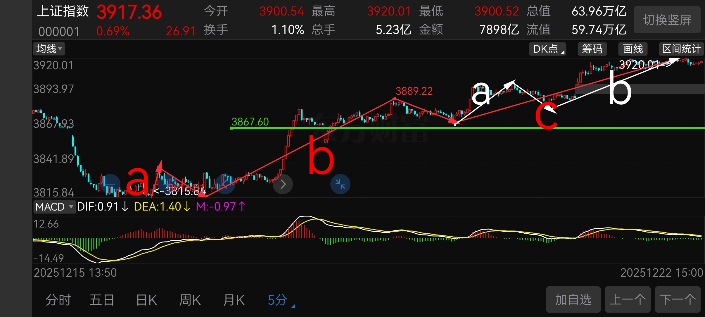 我们看红色线段,这只是中五分钟级别的上涨,涨了4天,力度很强,目前走c