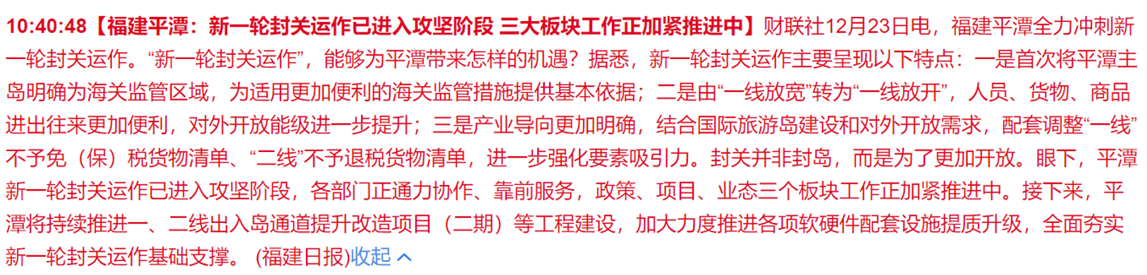 福建本地股要关注了!平潭封关,东百集团有没有机会?