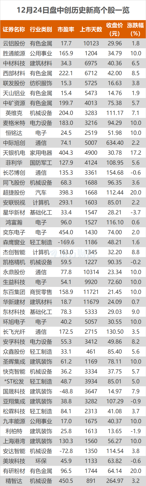 12月24日,A股三大指数今日集体上涨,沪指日线六连阳。截止收盘,沪指涨0.53%,收报3940.95点;深证成指涨0.88%,收报13486.42点;创业板指涨0.77%,收报3229.58点。东方财富Choice数据显示,今日有45只个股盘中股价创历史新高,分别为东百集团、英维克等。