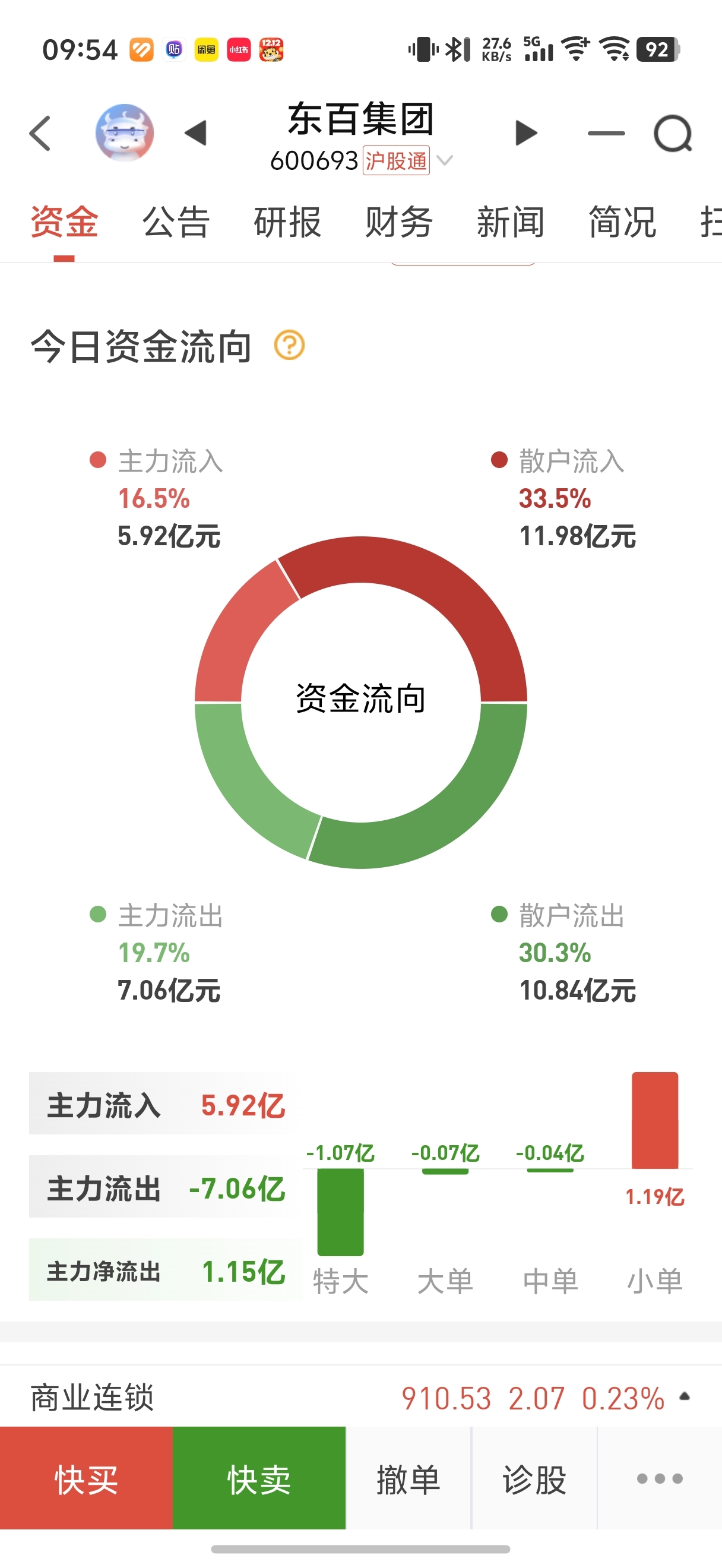 $东百集团(SH600693)$ 主力居然跑一个多亿了