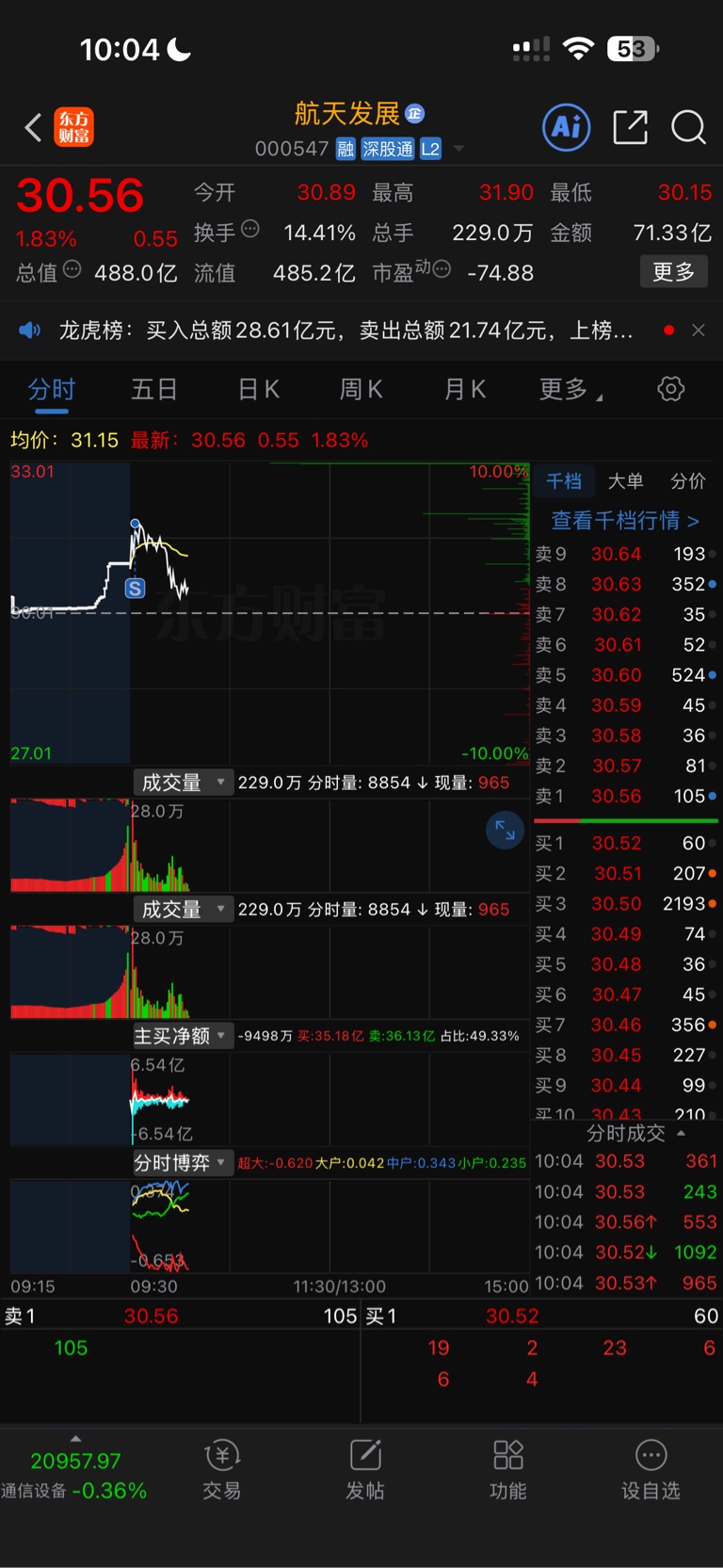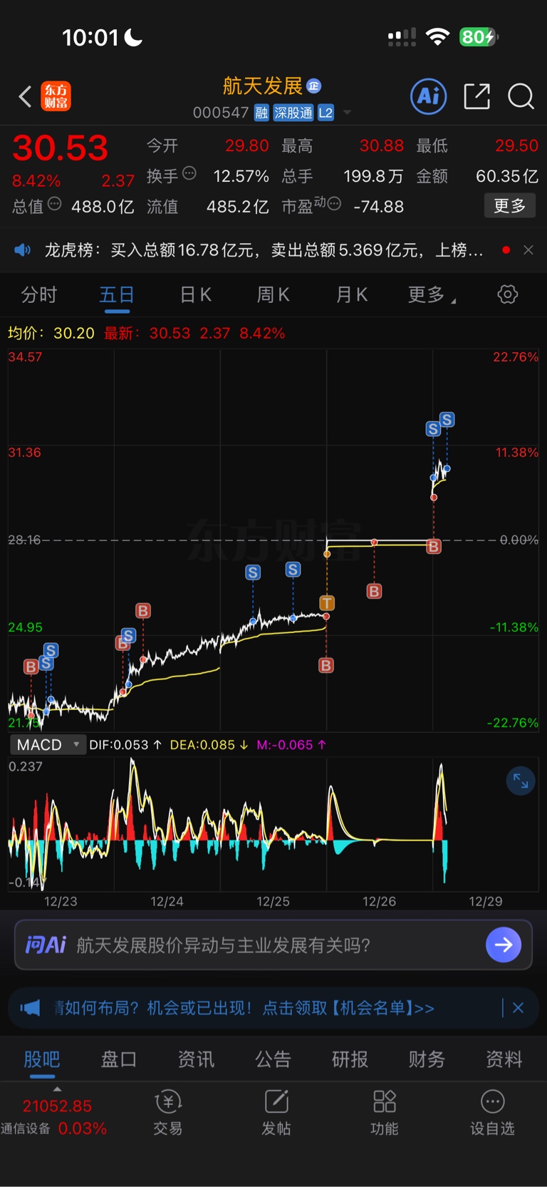 航天短期已经止盈完毕,后续会有一波调整,调整完毕会再次进场。$航天发展(SZ000547)$