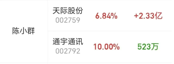 龙虎榜上看,陈小群新进了天际股份2.33亿,通宇通讯算是做T锁仓了。前一天龙虎榜看是加仓做T的通宇通讯,现在算是在里面做换手格局了。通宇通讯这个位置和形态,有点像二波刚起来的航天发展,而当时也是陈小群进的。