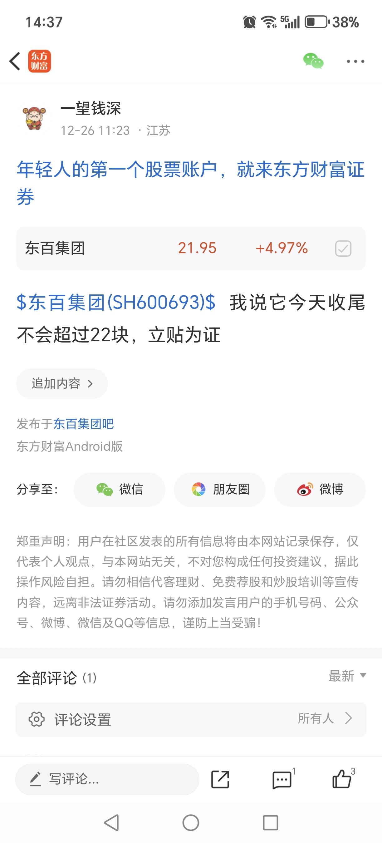 温馨提示: 1.根据《证券法》规定,禁止编造、传播虚假信息或者误导性信息,扰乱证券市场;2.用户在本社区发表的所有资料、言论等仅代表个人观点,与本网站立场无关,不对您构成任何投资建议。用户应基于自己的独立判断,自行决定证券投资并承担相应风险。《东方财富社区管理规定》