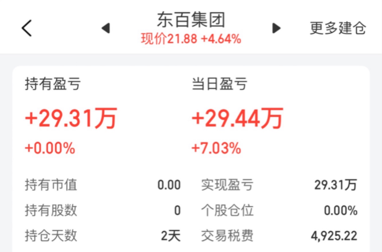 $东百集团(SH600693)$ 昨天收盘前进来的,今天赚7个点全部跑了,祝兄弟们留下的下周继续发大财~