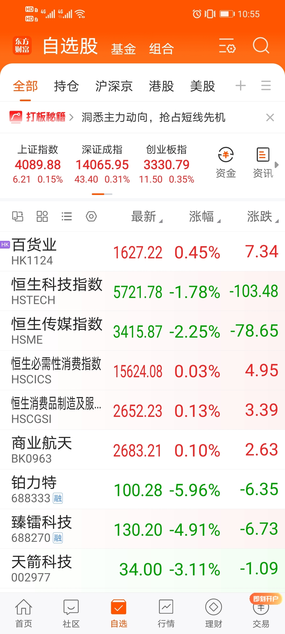 恒生百货四天大涨,恒生消费k线见底,也涨了四天,恒生科技头肩