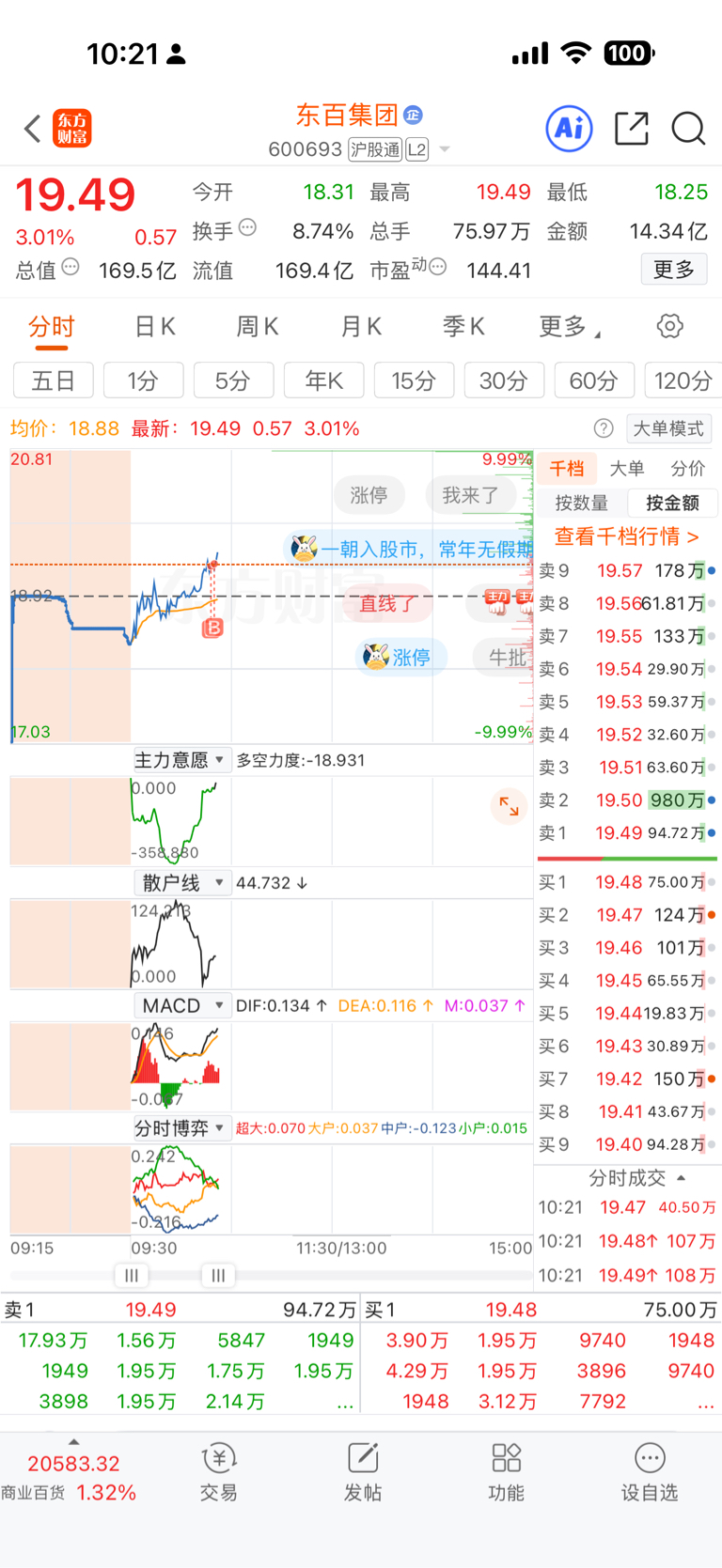 $东百集团(SH600693)$ 说三天就三天,回来了