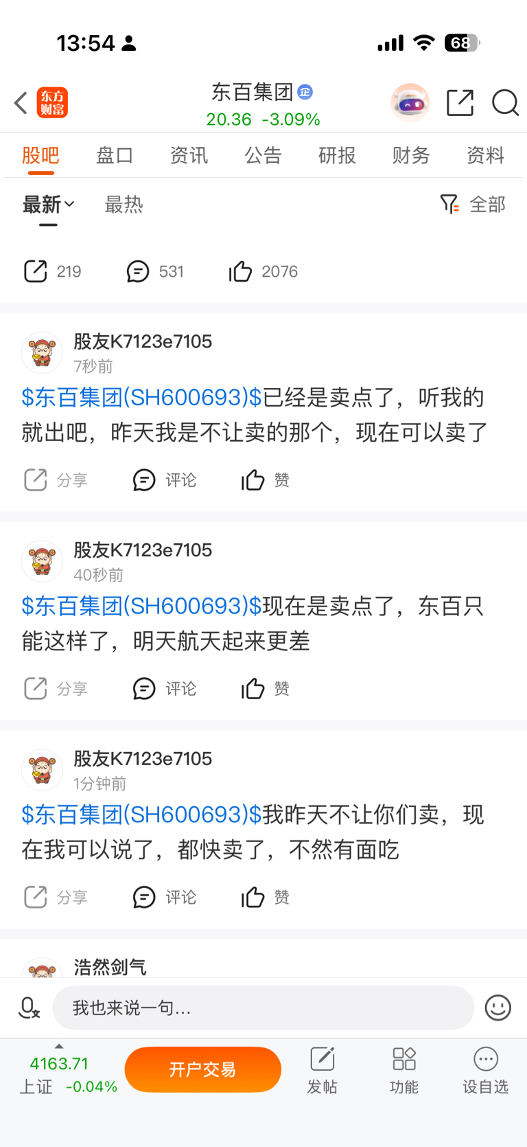 $东百集团(SH600693)$ 我自认为这个股炒的是航天的预期(而且尾盘就会表现),昨天我拦着不让卖是因为航天今天集体进异动,航天今天必倒下。但是我今天一个劲的让卖是因为航天依旧没si反复炸板,还有预期!