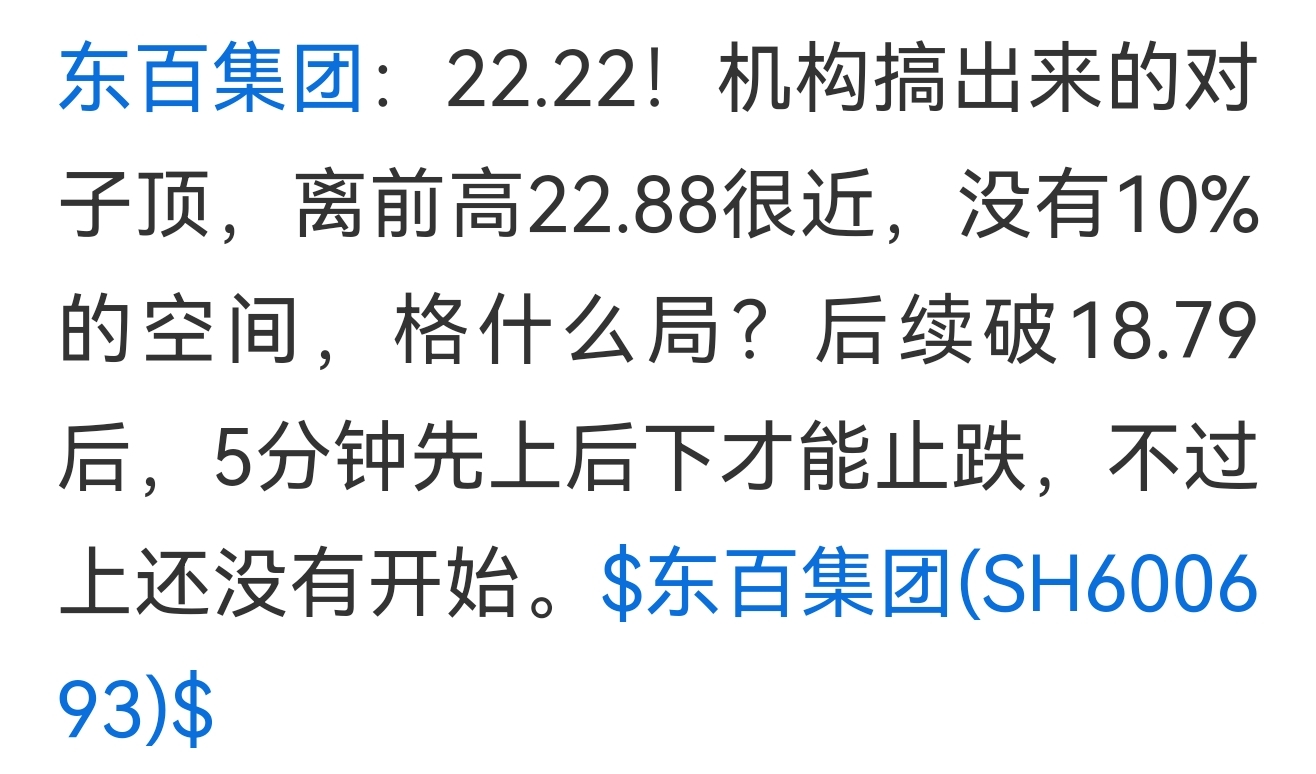 东百集团大幅低开最低到17.09,按昨日预测破18.79,符合预设的剧本。包括永辉超市也是与预测一丝不差的。后续的走势肯定是回补缺口,但不会那么快。