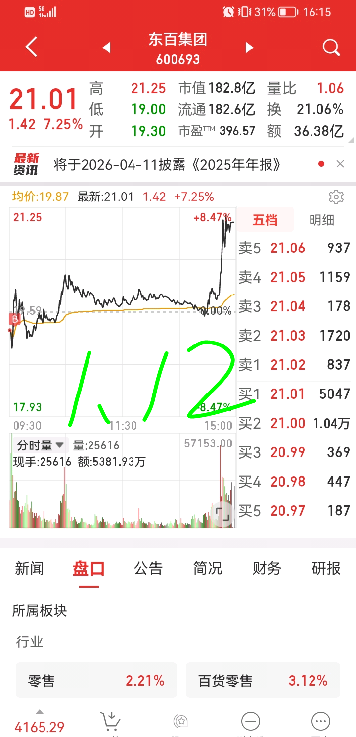 $东百集团(SH600693)$ 前天接回来,拉尾盘昨天开盘又逆市上涨,以为你很强要创新高呢就没卖完!