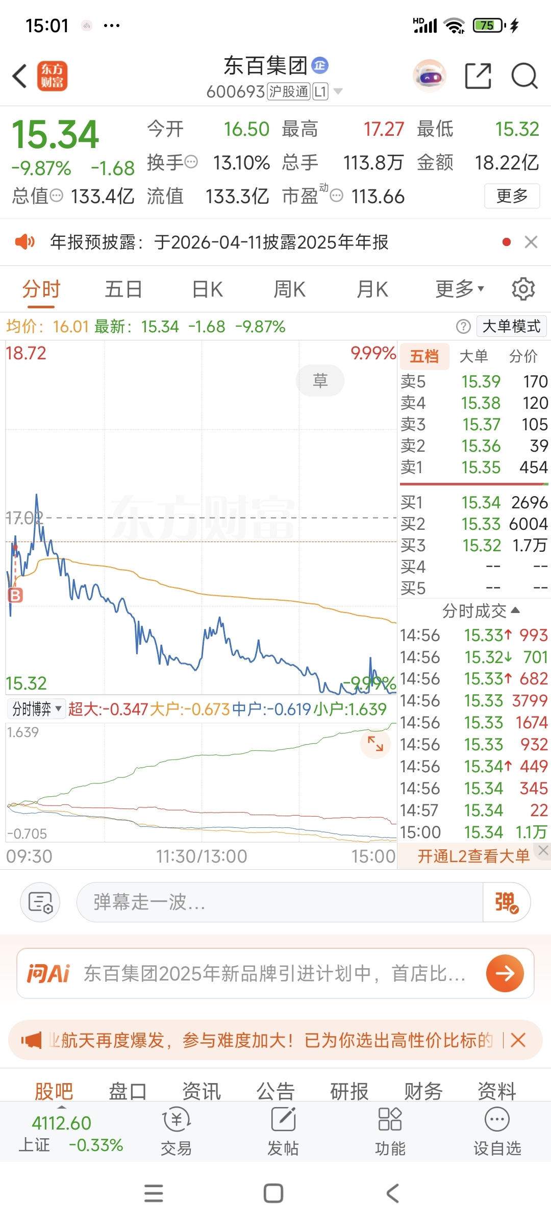 $东百集团(SH600693)$ 早上冲高买的,好想骂人啊