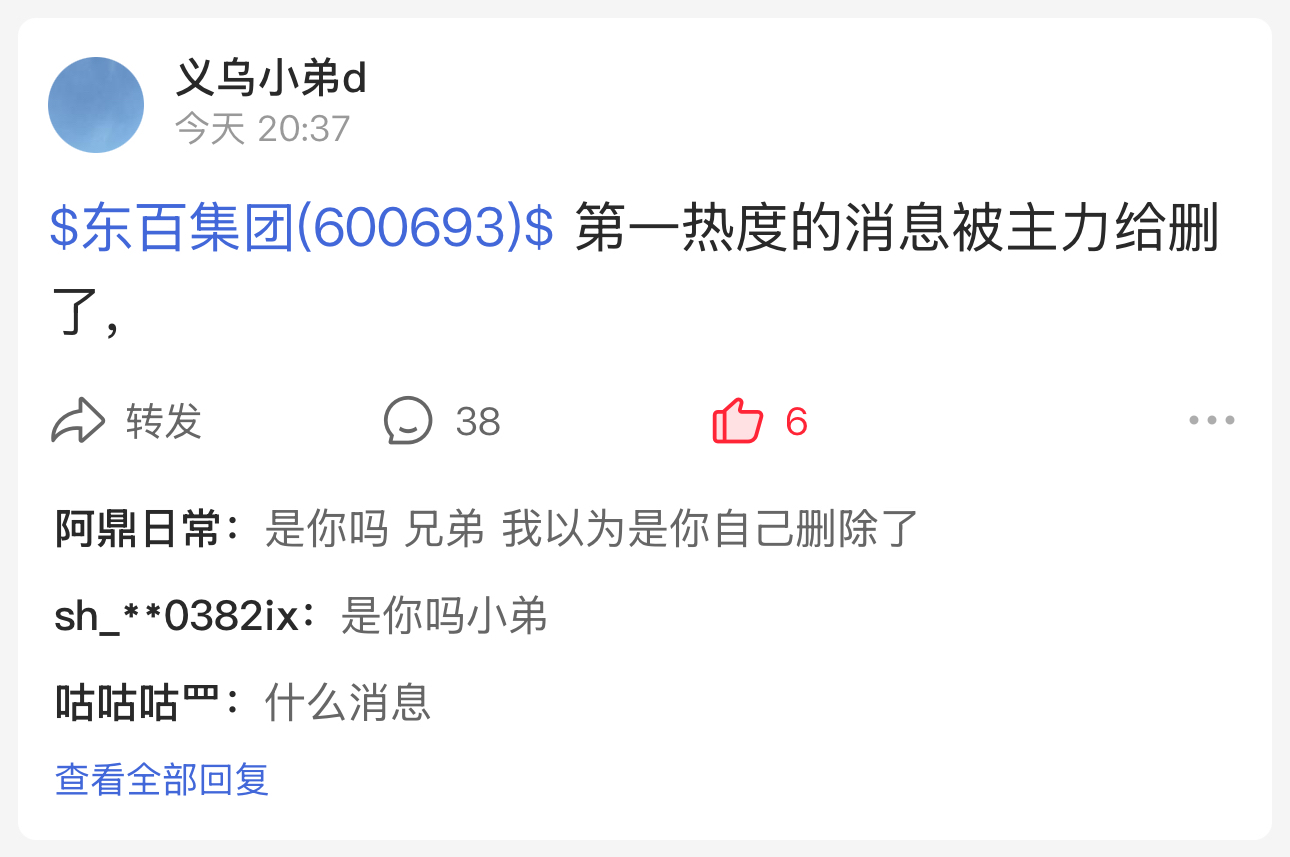 $东百集团(SH600693)$ 大家去同花热门顶上去 主力删人家帖子
